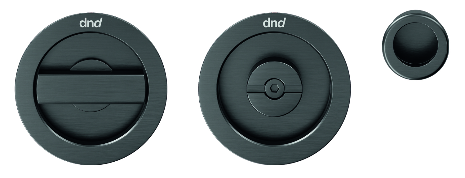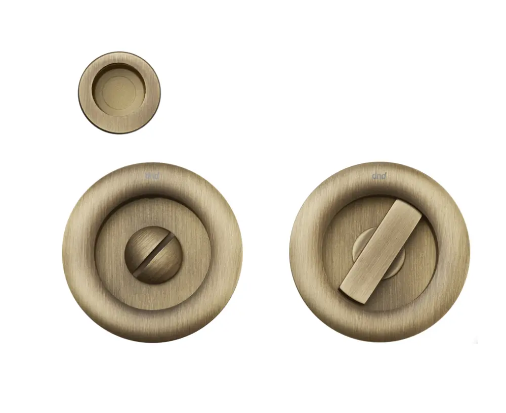 Paire de poignées cuvettes rondes à condamnation avec tire doigt rond pour équiper une porte coulissante à galandage.